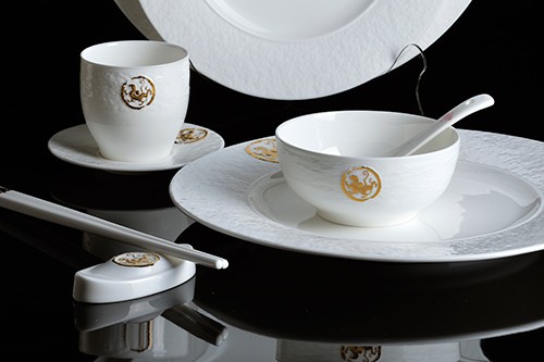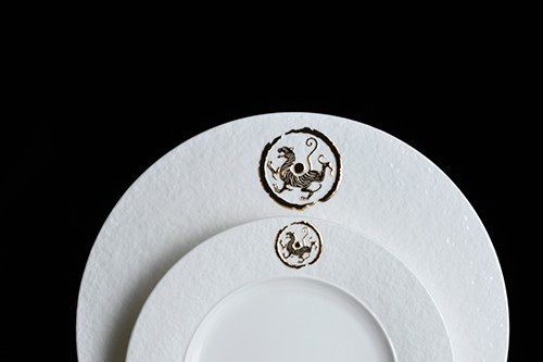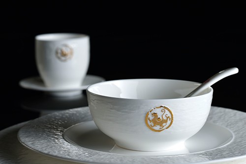 中國古代傳說中,四神獸為天之四靈,掌管天地四方,故王者宮殿喜用四獸為瓦,取平定四方之意。《淮南子》云:“西方金也,其獸為白虎?!鄙瘾F白虎掌管西方,是正氣之神,有辟邪懲惡、招財納喜之意,多受達官貴人喜愛。本套作品創意來自漢代未央宮遺址出土的白虎紋瓦當,取其高貴威嚴之勢、古樸深遠之韻,虎躍玉間,平凡的餐具一躍成為尊貴高雅的象征,是彰顯大氣、耀顯尊榮的選擇。