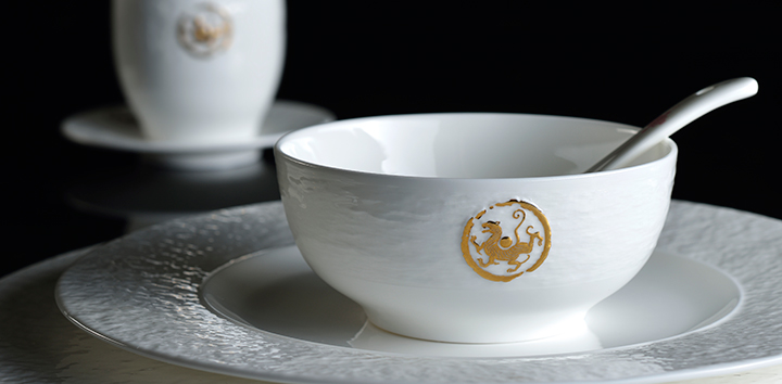 中國古代傳說中,四神獸為天之四靈,掌管天地四方,故王者宮殿喜用四獸為瓦,取平定四方之意。《淮南子》云:“西方金也,其獸為白虎。”神獸白虎掌管西方,是正氣之神,有辟邪懲惡、招財納喜之意,多受達官貴人喜愛。本套作品創意來自漢代未央宮遺址出土的白虎紋瓦當,取其高貴威嚴之勢、古樸深遠之韻,虎躍玉間,平凡的餐具一躍成為尊貴高雅的象征,是彰顯大氣、耀顯尊榮的選擇。